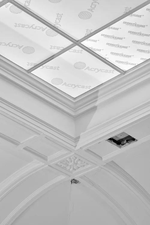 The design exposes the ornate plaster ceiling details and references the internal stair. The scope includes a new desk made from reclaimed Iroko, a storage wall, art lighting, marmoleum flooring and acoustic linings, plus new entrance display furniture.
